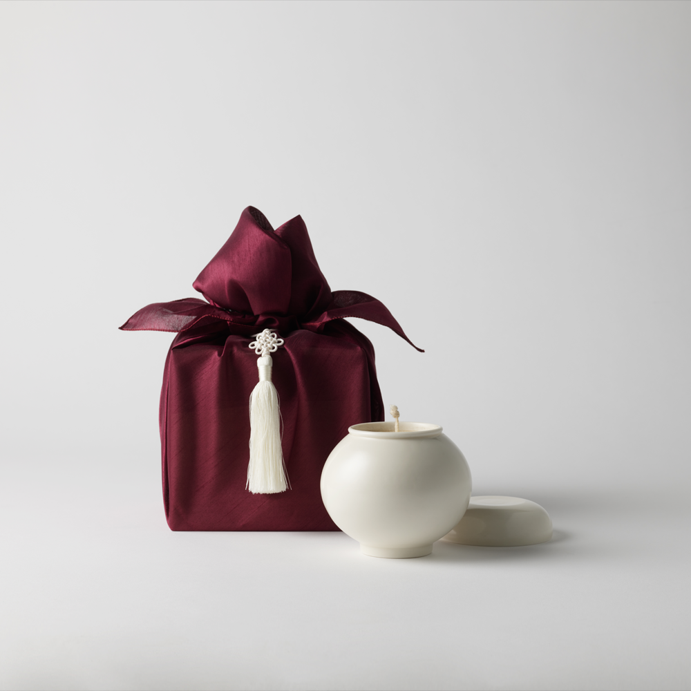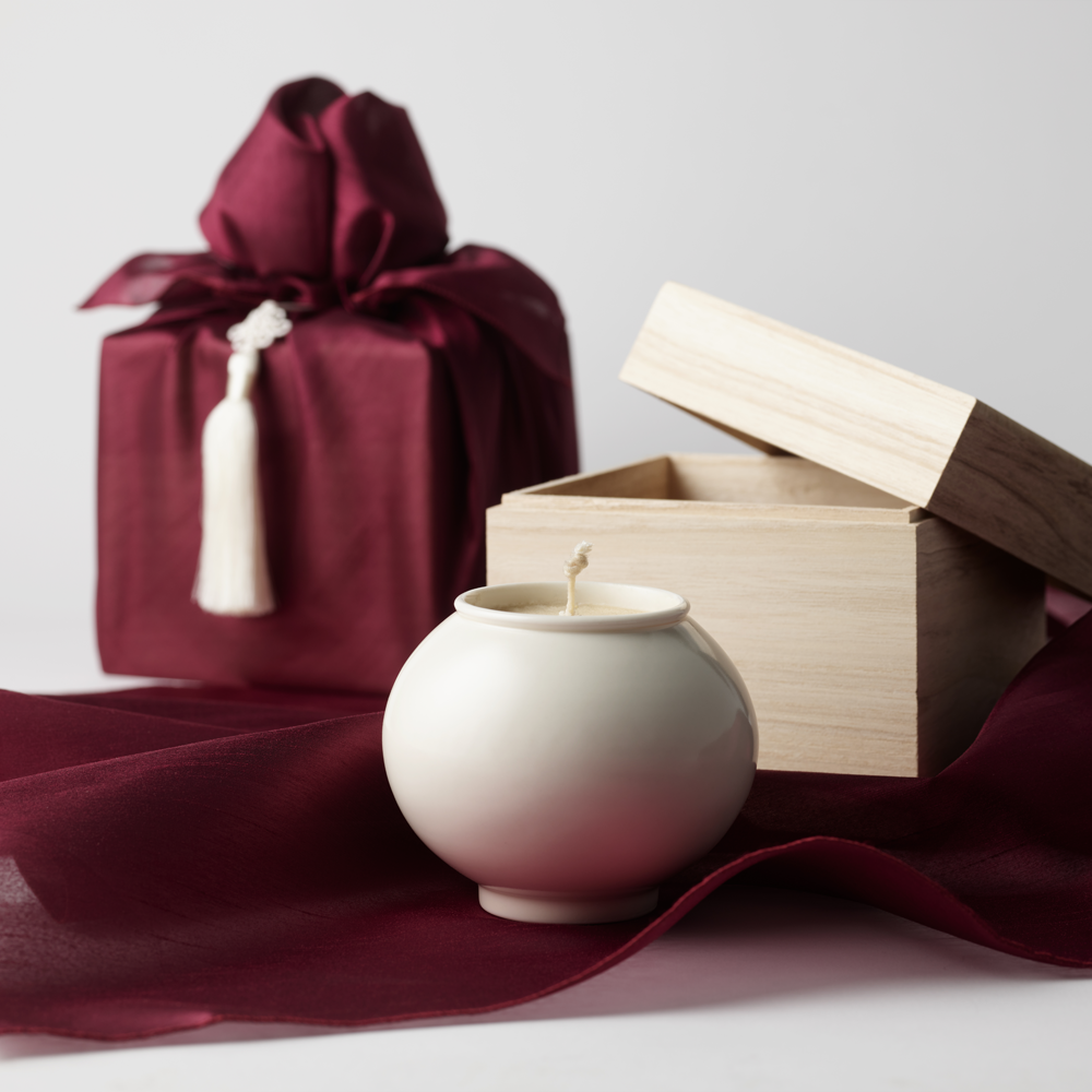 초를 켠 백자 달항아리를 지긋이 바라보며