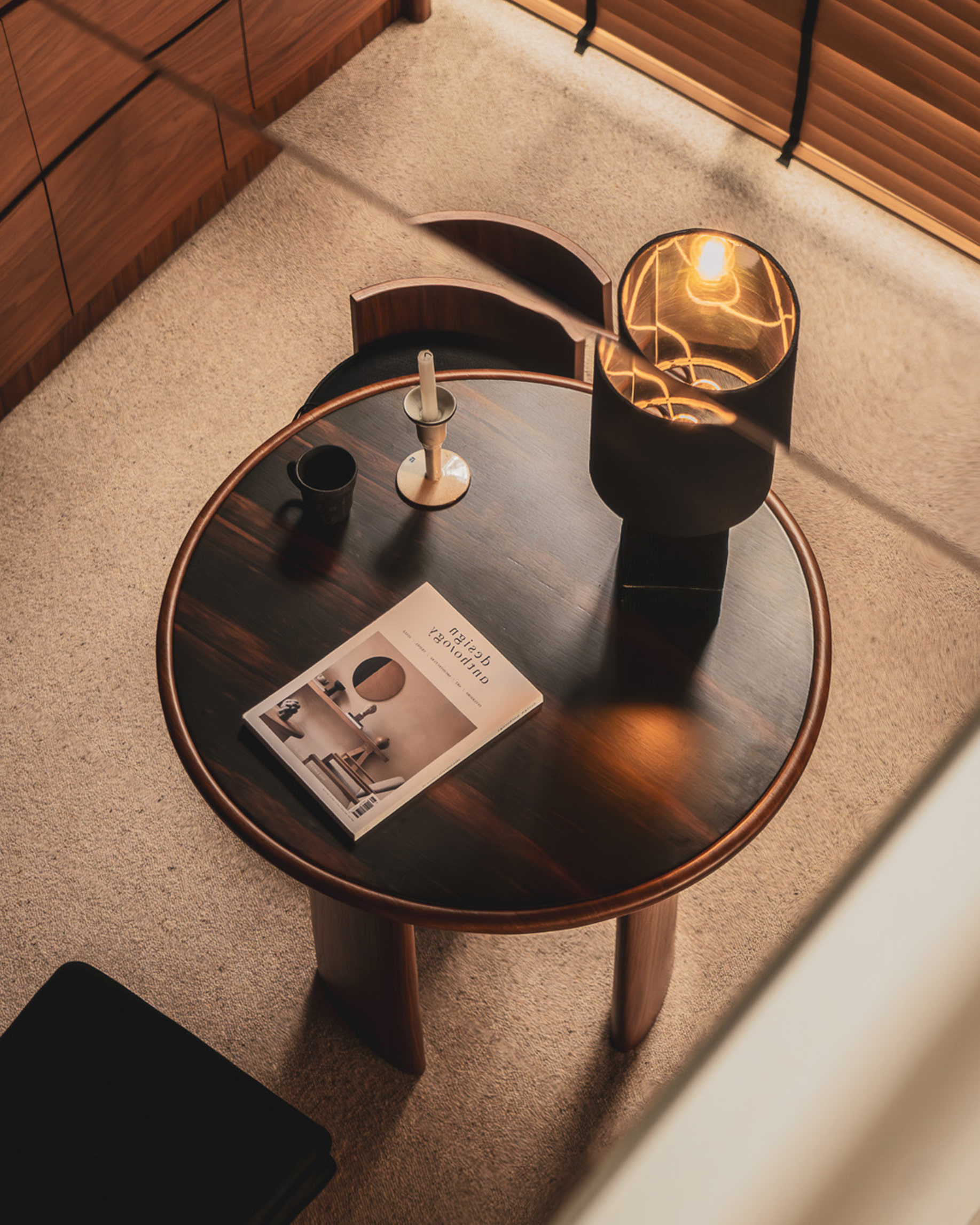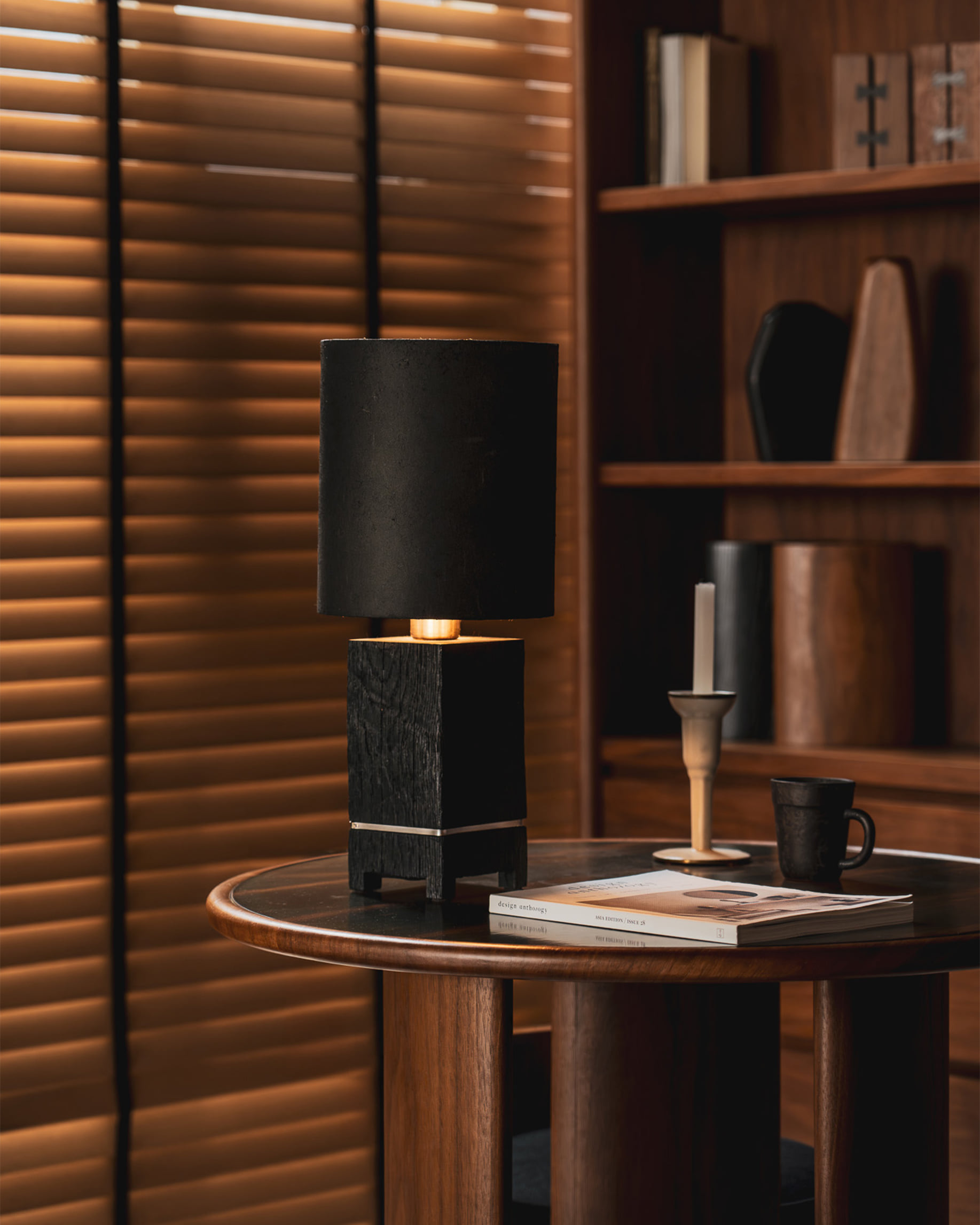 전등의 갓과 한옥 고재를 사용한 베이스로 구성된