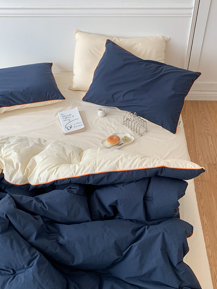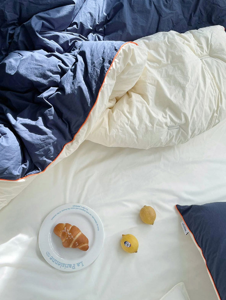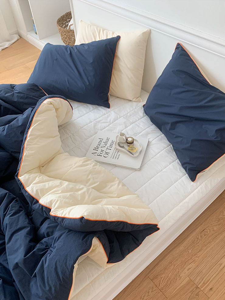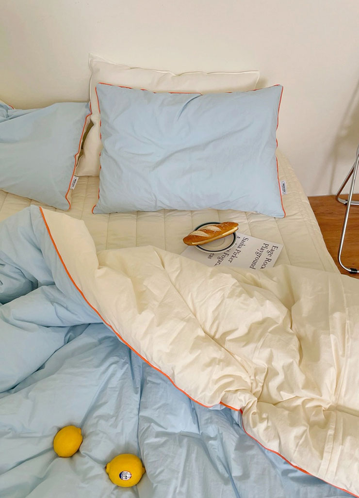 침구 테두리의 오렌지색 컬러감이 포인트로
